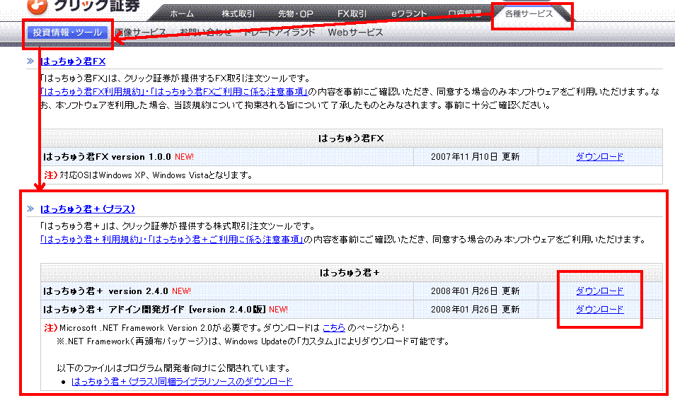 3.クリック証券から、発注君プラスをダウンロードする。(FX版もあります)